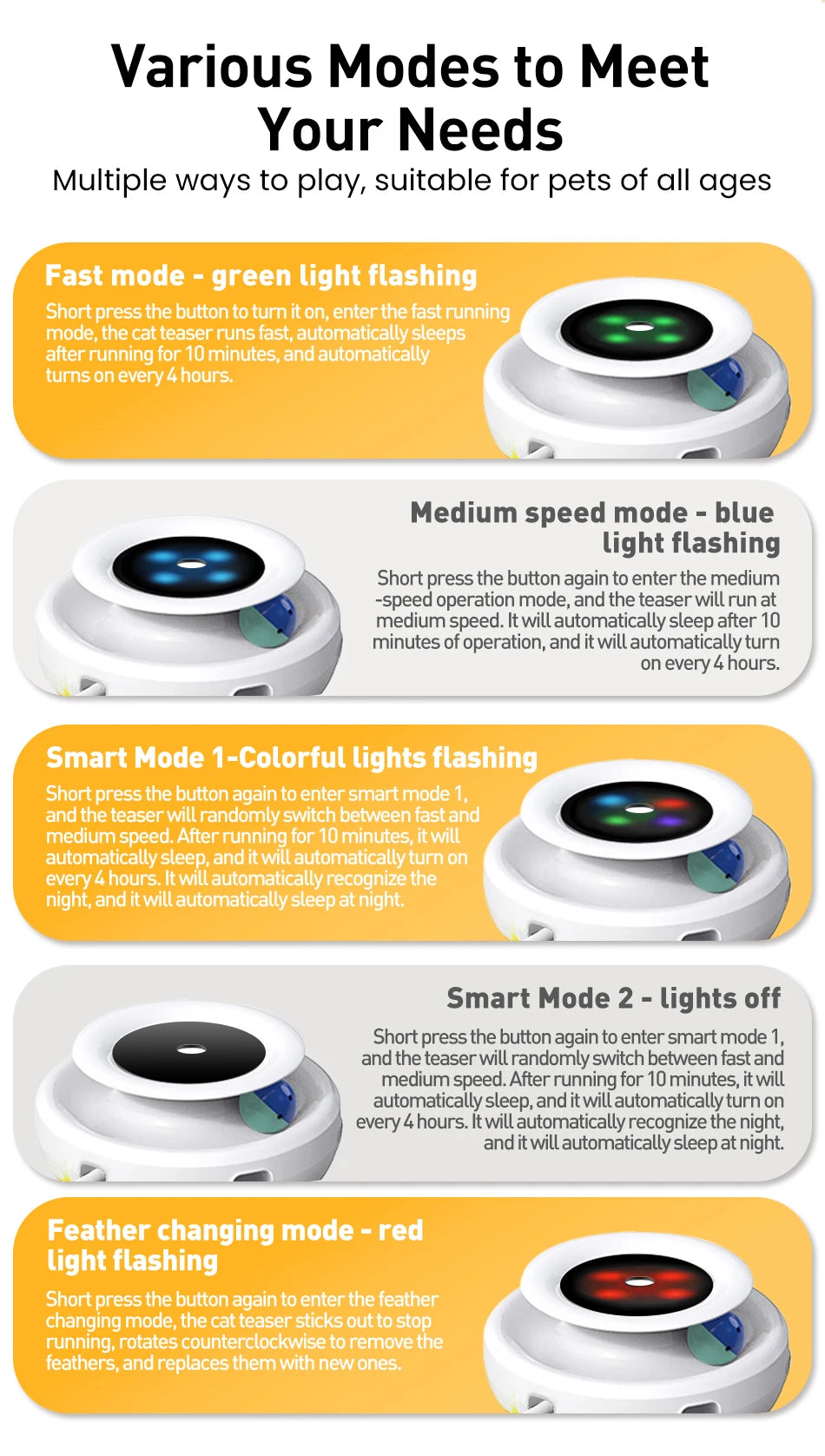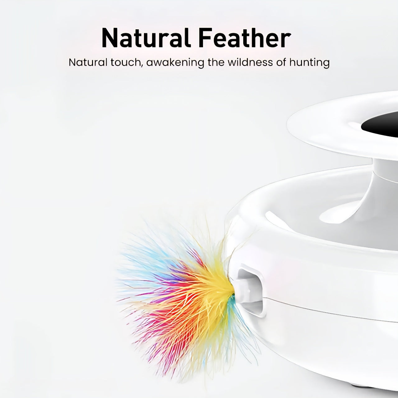 1. Feather Mode – three vibrant, random-spin feather wands mimic real prey to awaken your cat’s hunting instincts.