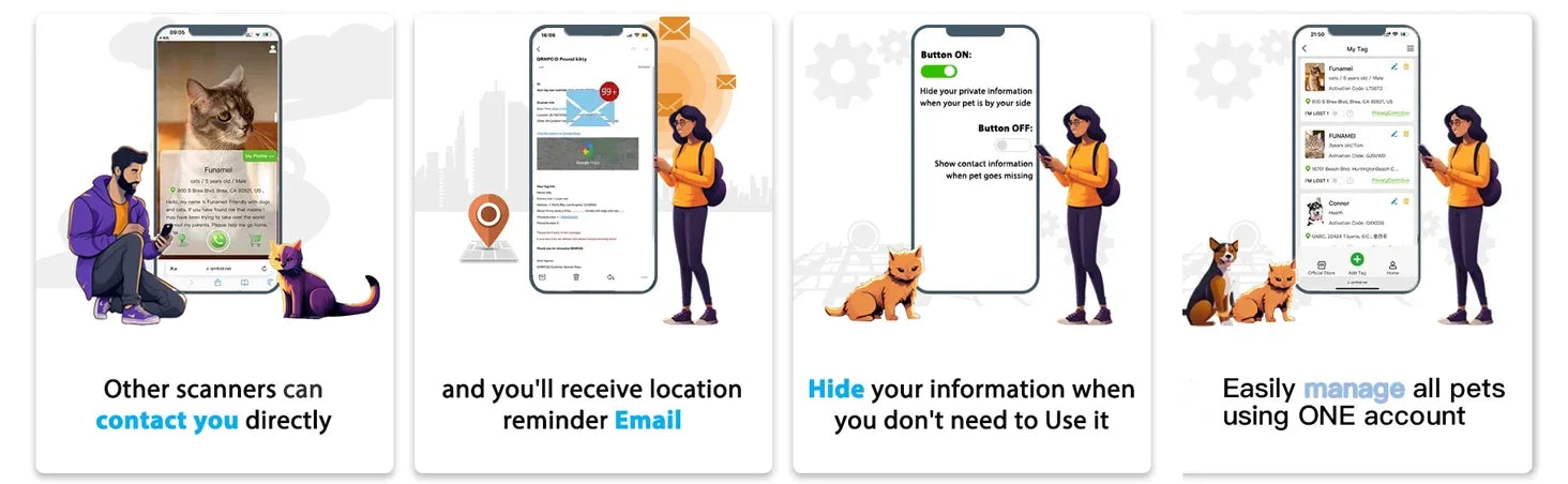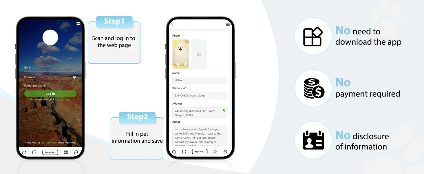 [Receive Instant Email] If someone scans the QR code, strangers can scan the code to check the phone number you left, or send address to your email, keep you stay informed and locate your pet quickly. Free online pet page prevent lost, No Subscription or Any Other Fees!
