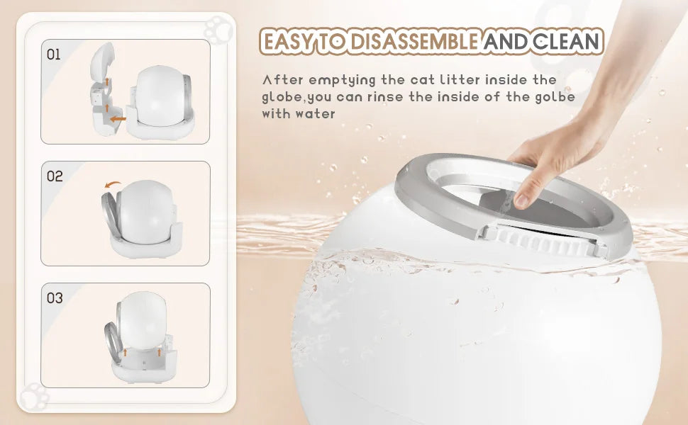 - Easy to Clean: Designed for convenience, our cat litter box can be easily dismantled for daily cleaning. Simply empty the litter and rinse it directly with a water gun, taking care to avoid wetting the base. For the base, a gentle wipe with a damp cloth suffices to keep it clean.