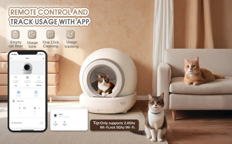 - App Control: The self-cleaning litter box is remotely controlled using an App (2.4GHz only). It tracks your cat's usage time and litter volume so you can manage your cat's space from anywhere. Smartphone one-touch cleaning, seamless litter changes and scheduled cleaning times take the hassle out of frequent cleaning