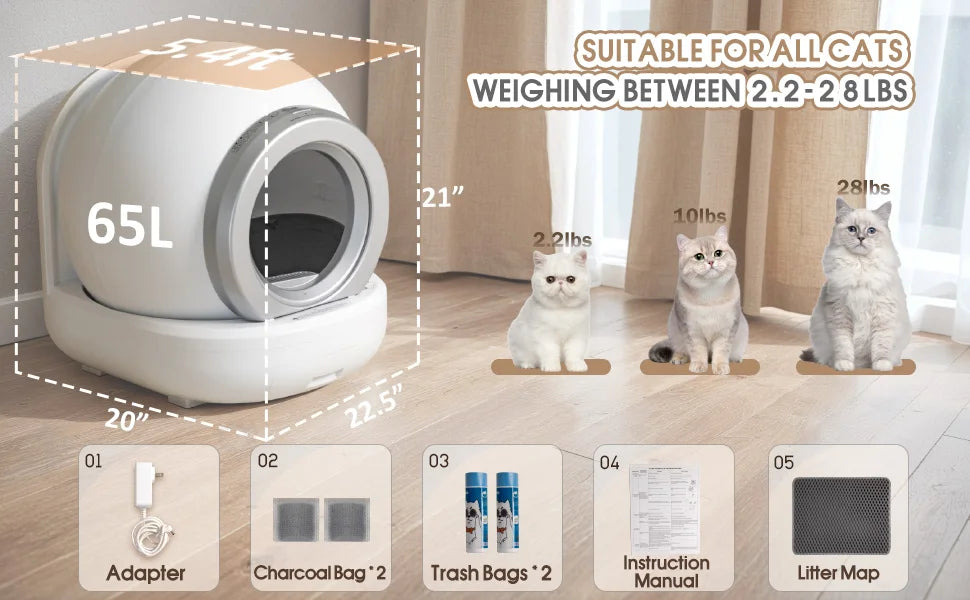 - Extra Accessories: Package includes automatic litter box, one litter mat, one power adapter, two deodorising charcoal packs, litter bags (2 rolls), product manual. This self-cleaning litter box is compatible with any ≥ 17.7' diameter litter bag