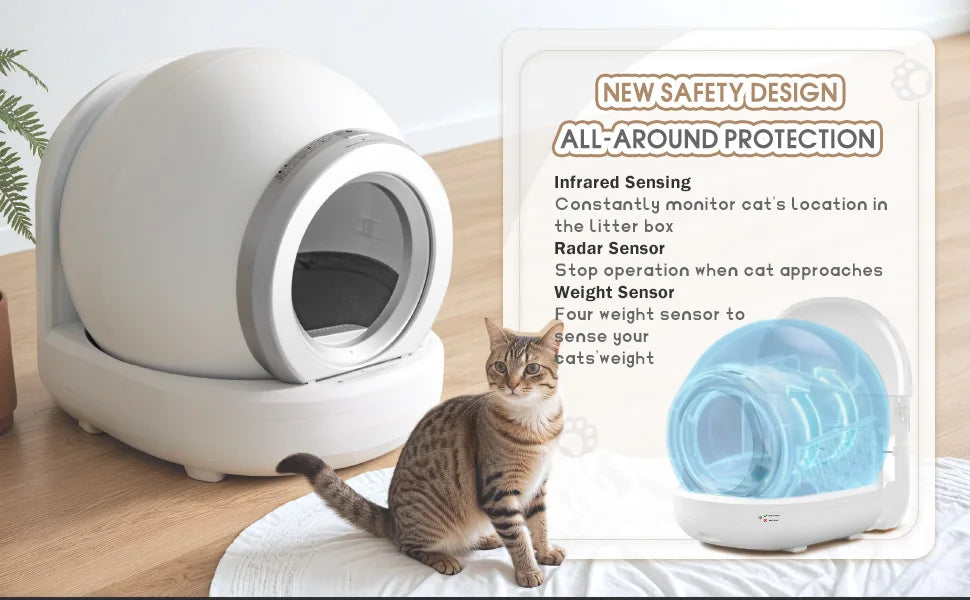 - Safe Access: Our cat litter box has a series of safety mechanisms and advanced intelligent sensors, when your pet approaches, these sensors detect its presence with remarkable sensitivity, promptly halting all operations to ensure your cat's utmost safety and well-being.